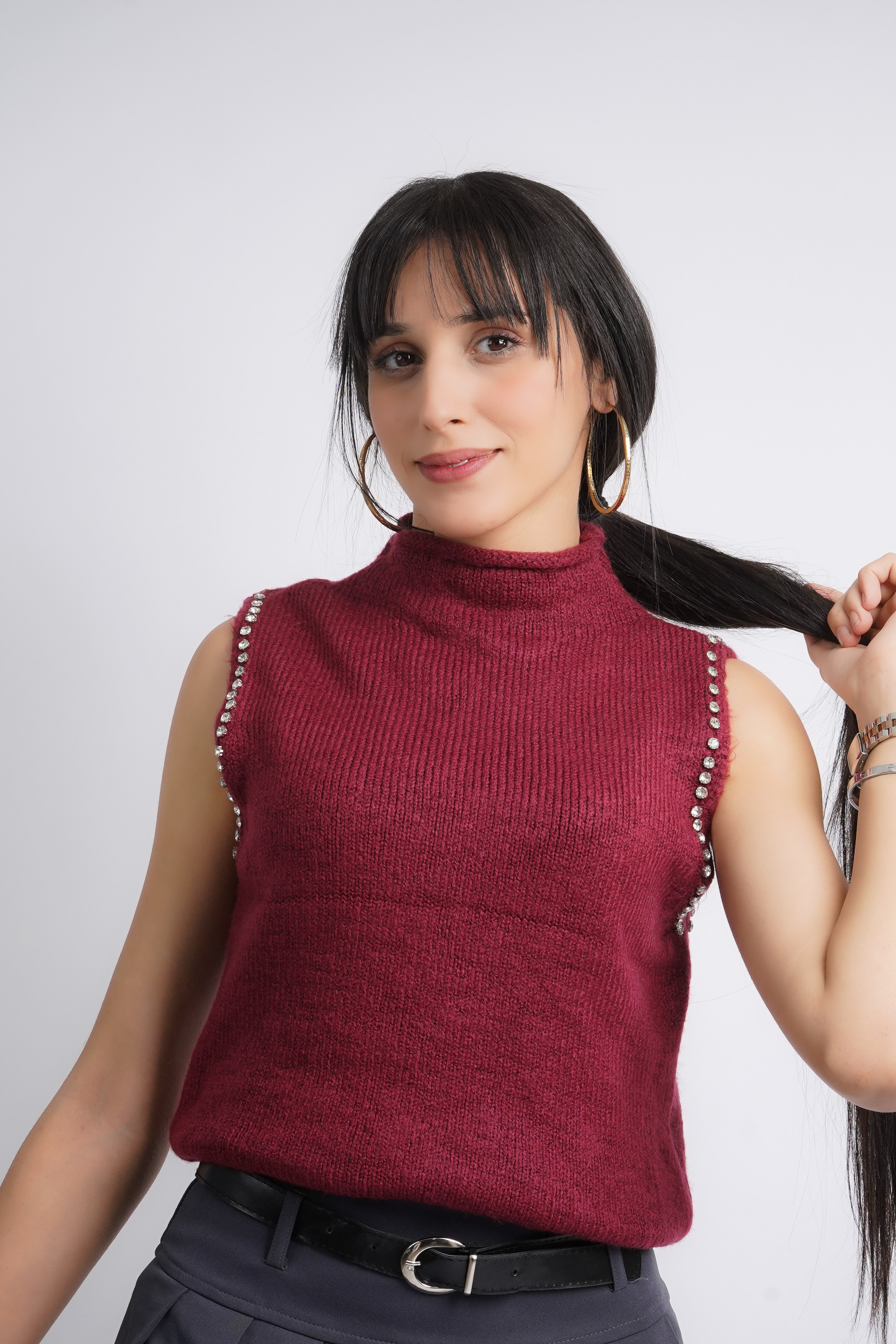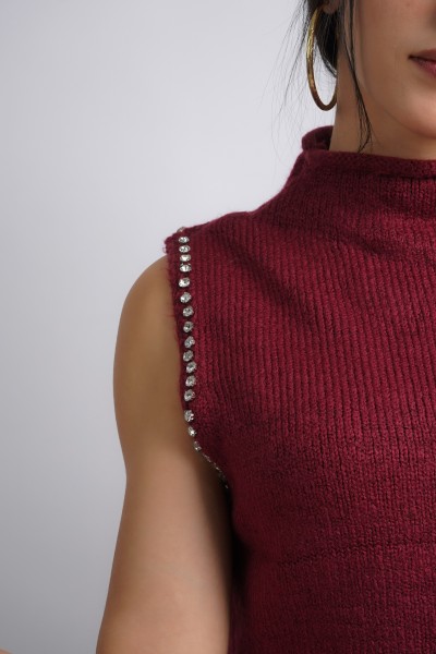 Haut tricoté sans manches bordeaux. doté d'un col montant, se distingue par une rangée de strass ou de pierres décoratives argentées le long des coutures des épaules.