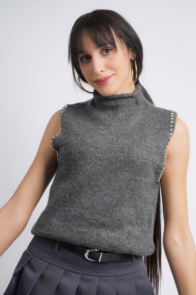 Haut tricoté sans manches bordeaux. doté d'un col montant, se distingue par une rangée de strass ou de pierres décoratives argentées le long des coutures des épaules.